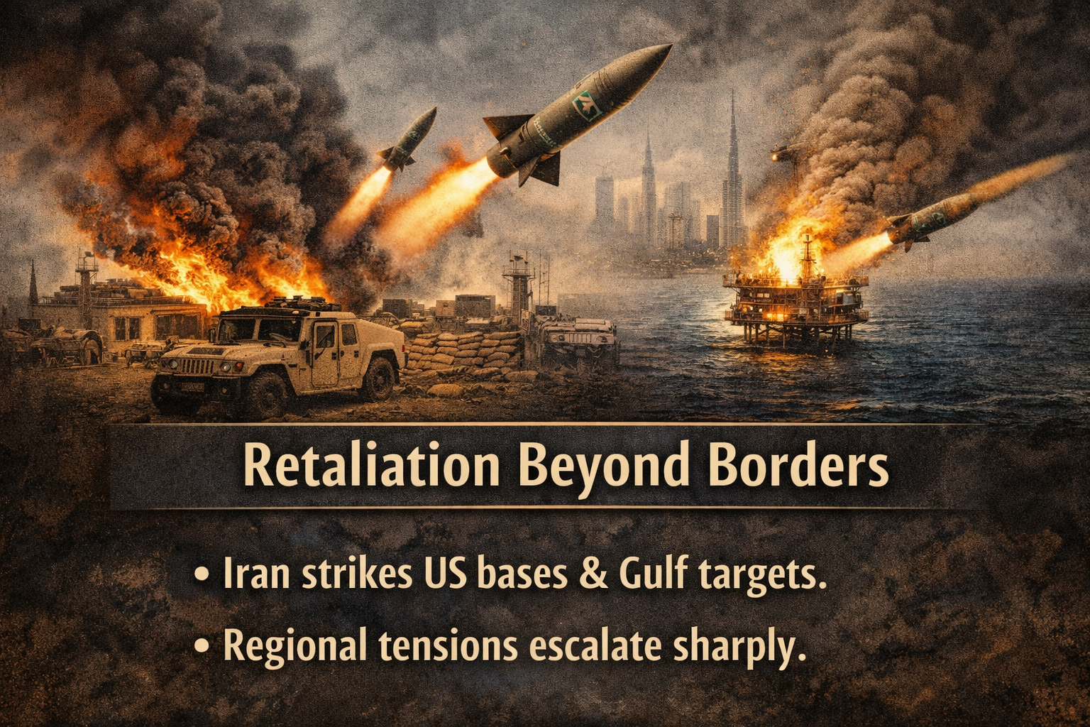 🔴 Iran’s retaliation has broadened into a widespread campaign targeting US military assets across the Gulf, with Tehran’s Islamic Revolutionary Guard Corps asserting that missiles and armed drones were launched at US bases and allied positions in multiple Gulf states, including Kuwait, Qatar, Bahrain, the UAE and Saudi Arabia in response to recent US-Israeli strikes on Iran.